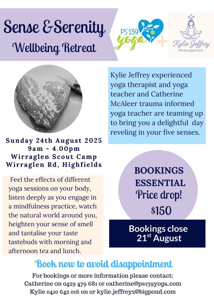 PS139 Yoga is teaming up with Kylie Jeffrey #thatyogachick to bring you Sense & Serenity – Wellness Retreat at Wirraglen Scout Camp, Highfields .